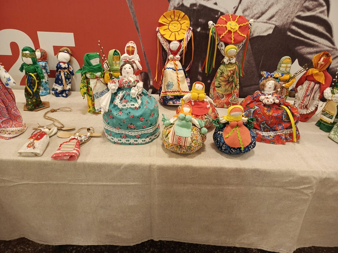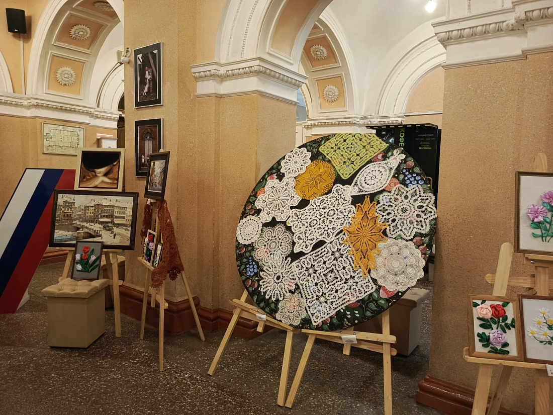 В фойе Дворца культуры развернулась выставка работ мастериц-участниц проекта: фотоработы, куклы, изделия из брюггского кружева, картины, вышитые лентами и бисером.